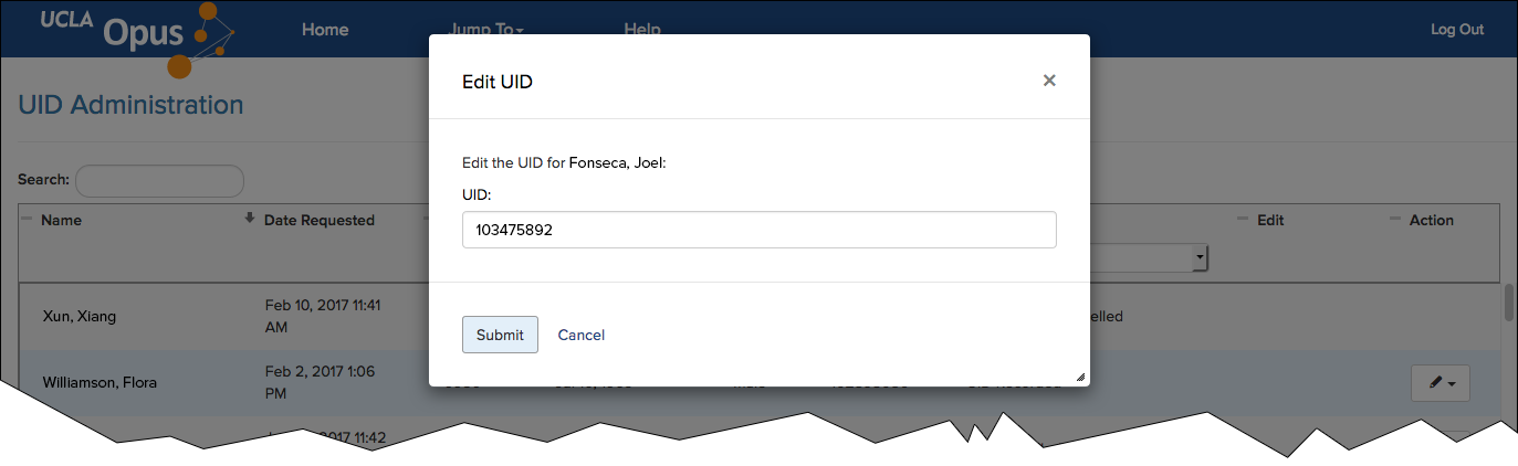 For each record on this page with a UID Status of "UID Requested," an Enter UID button appears under the Edit column in its row. This allows an administrative user to associate a University ID with the Opus record, as long as a UID has been requested for this record via the Request a UID page (see link near the end of this article). Clicking the Enter UID button displays a modal window in which the user may enter the UID to be associated with the record in that row (after locating the UID in a system outside of Opus).