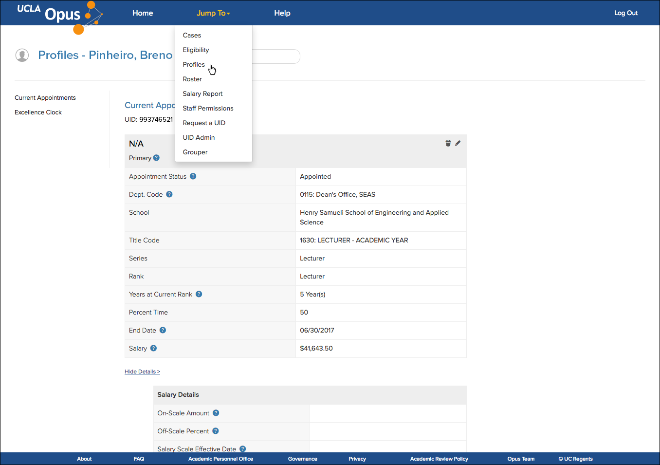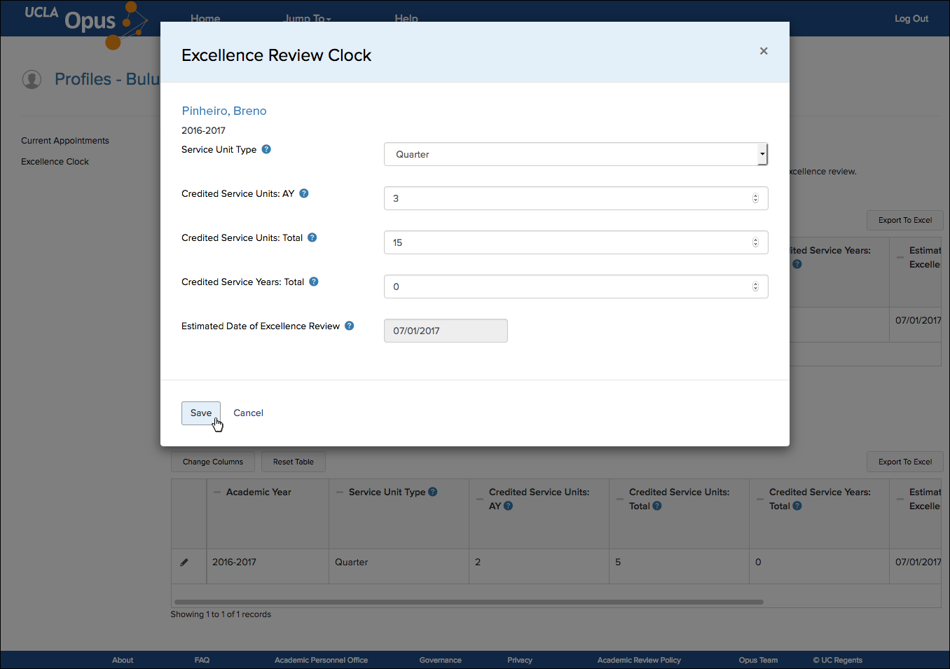 In order to record data for the Excellence Review Clock, you need to know what to record. This will depend on records kept outside of Opus. Once you know what you'll need to record on this screen (most likely the number of quarters/semesters the appointee accrued in the current year), you can enter this data in their profile with the following steps.