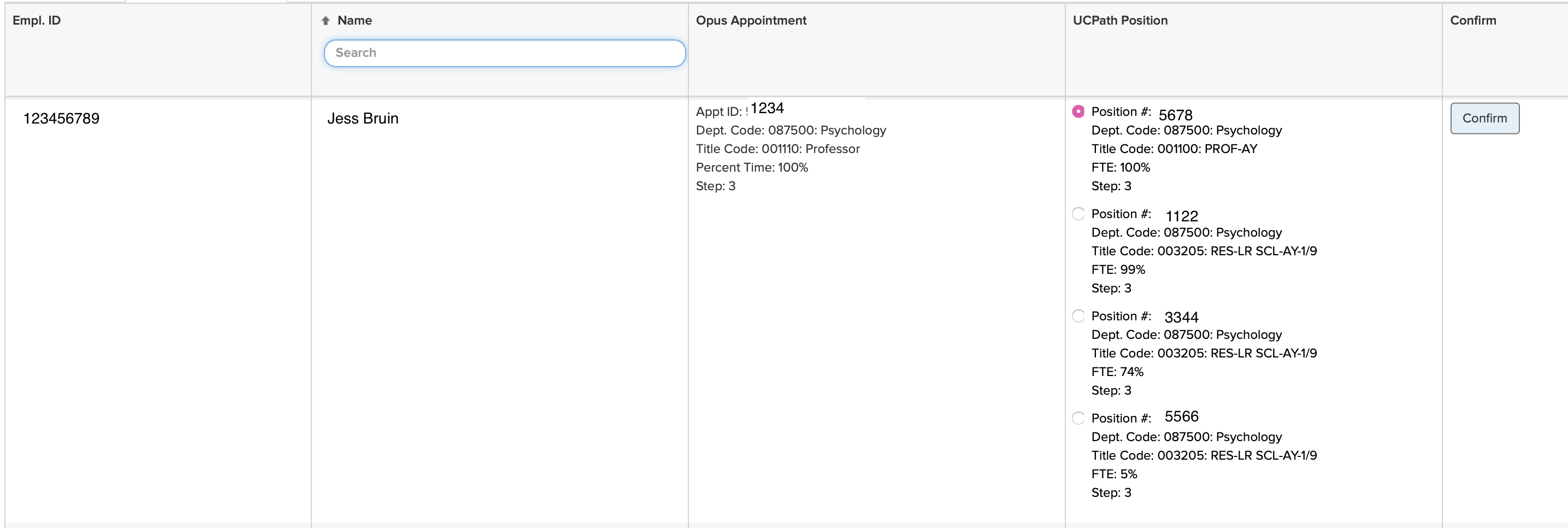 PATH has Jill Bruin in the Emeritus series (job code 001132) while Opus has her in the Regular Professor series (title code 001100). Opus might not suggest this as a match because the systems have Jill in different series. Jill’s Opus appointment will be listed on the No Match tab. If Opus needs to be updated, the department staff can make that update (or contact Opus Help if they cannot make the update themselves). When Opus and UCPATH have the same series for Jill Bruin, she’ll appear on the Possible Match tab.