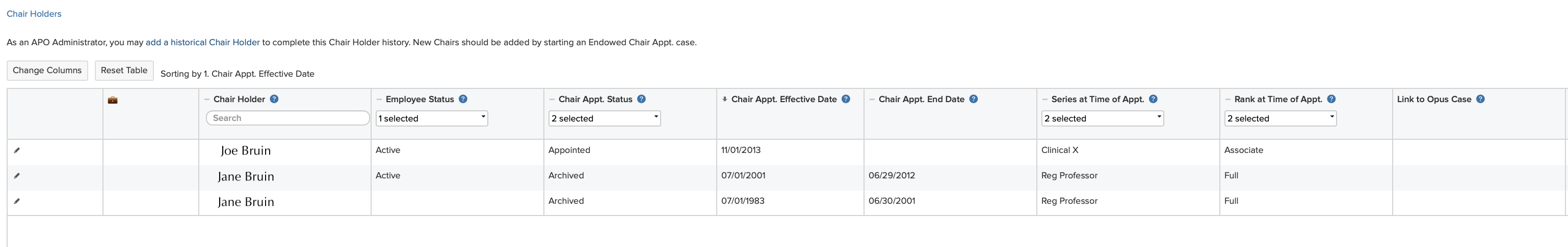 Prospective: When an Endowed Chair Appointment case is created, a new row will appear on the Chair Holder table with a link to the case (historic cases will not be linked). The Chair Holder status will be "prospective".