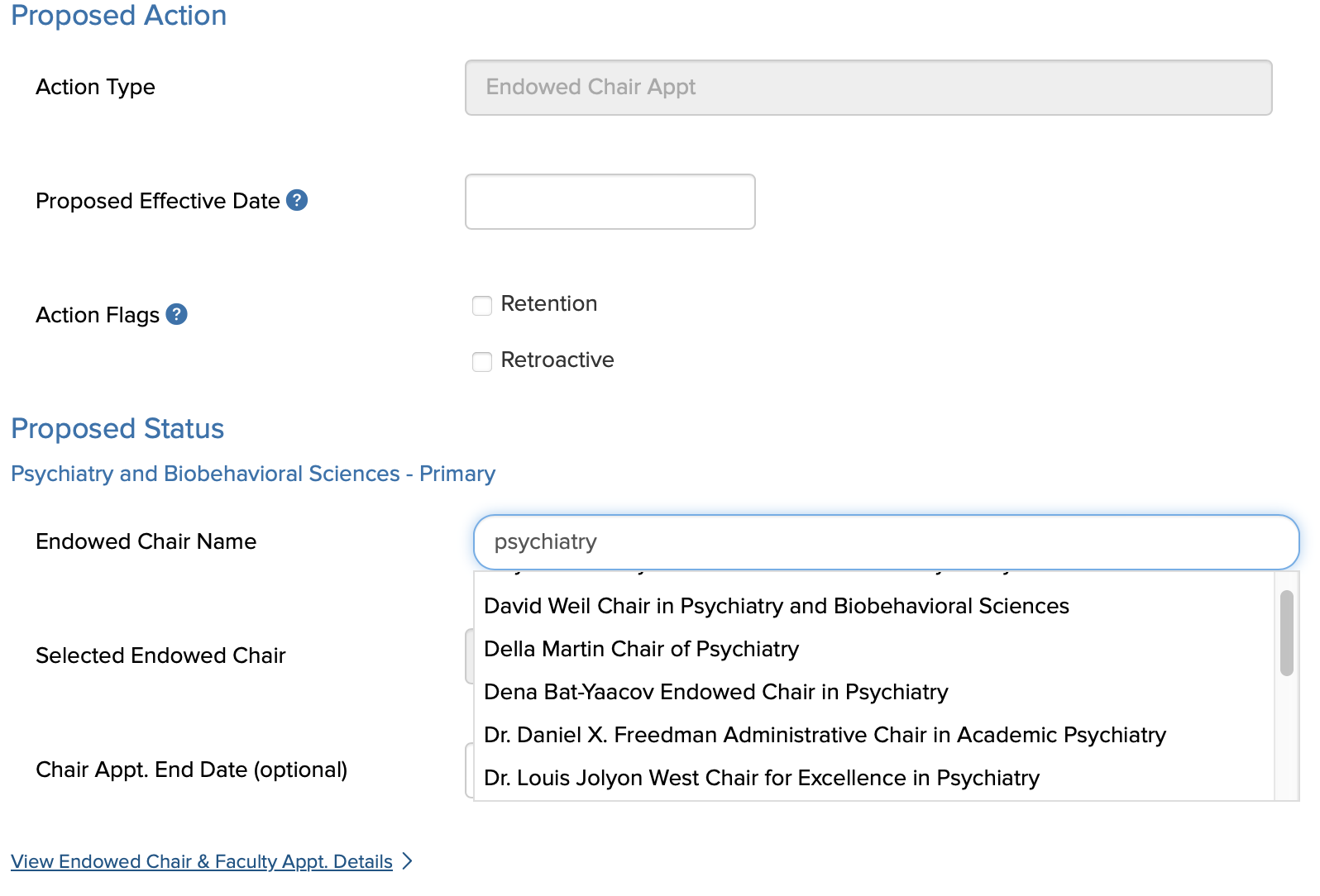 Choose which endowed chair the appointment is for when creating an Endowed Chair Appointment case.