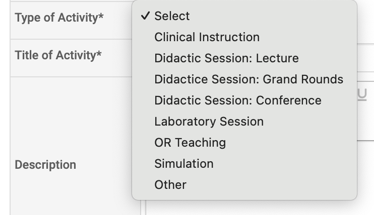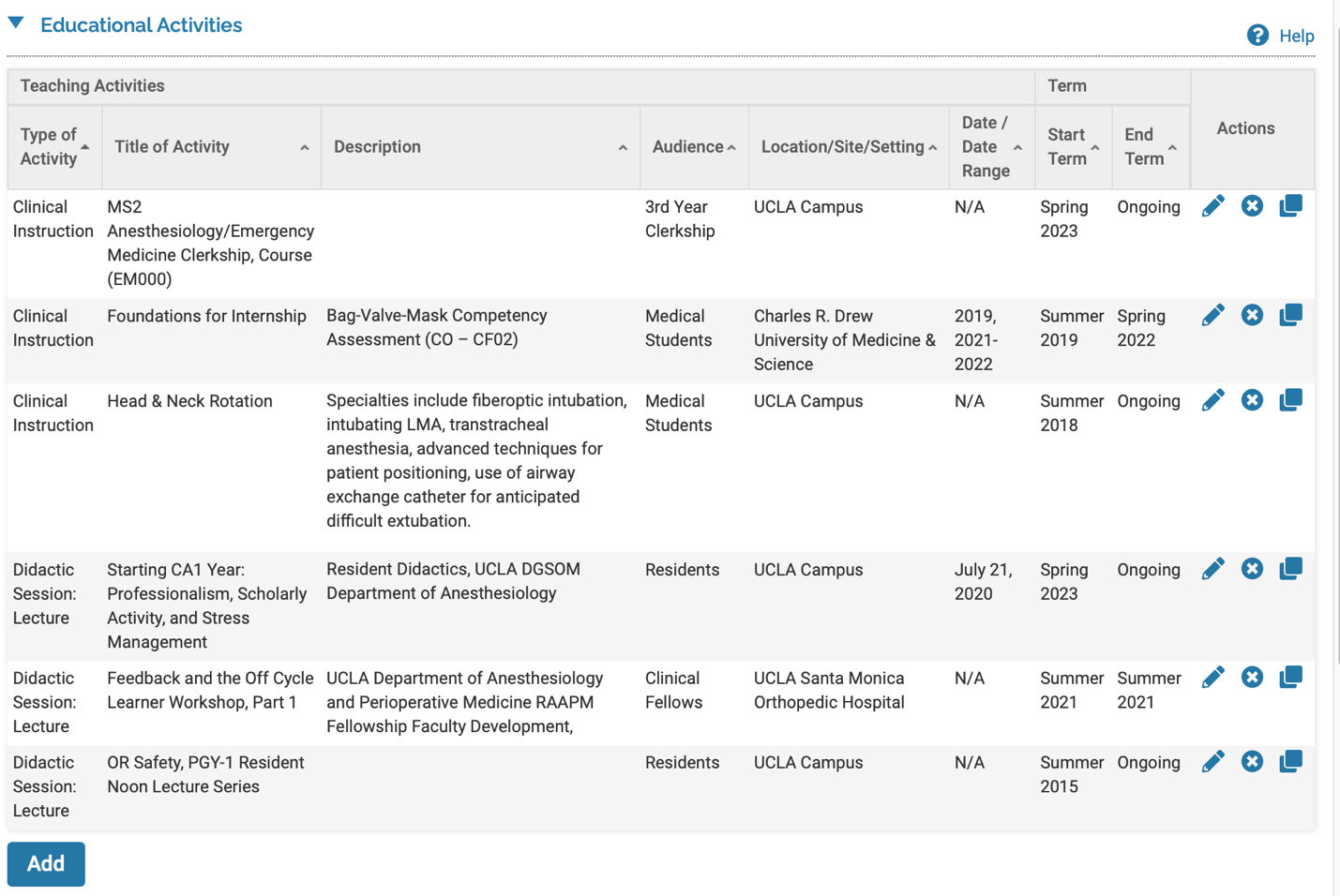 The Educational Activities section was designed for the wide variety of activities conducted by faculty in the School of Medicine. All activities that could be defined as educational in nature should be listed here, including clinical instruction, didactic sessions, simulations, and more.