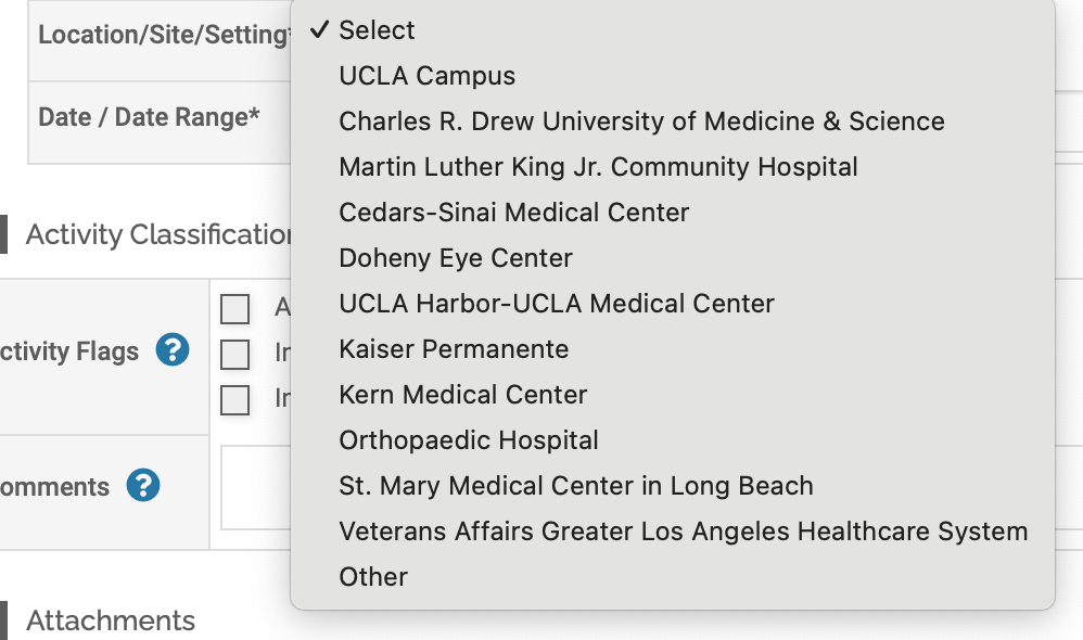 Choose the location or site of your activity. If none of the values is a good match, choose "other" and enter the name of the site.