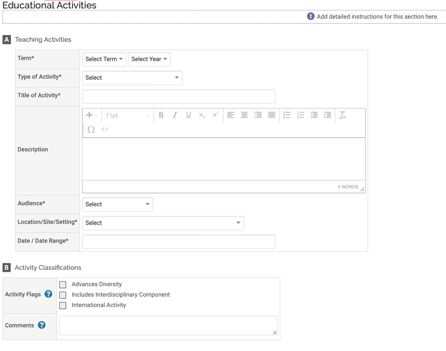 This article provides instructions for the Educational Activities section used by the School of Medicine.